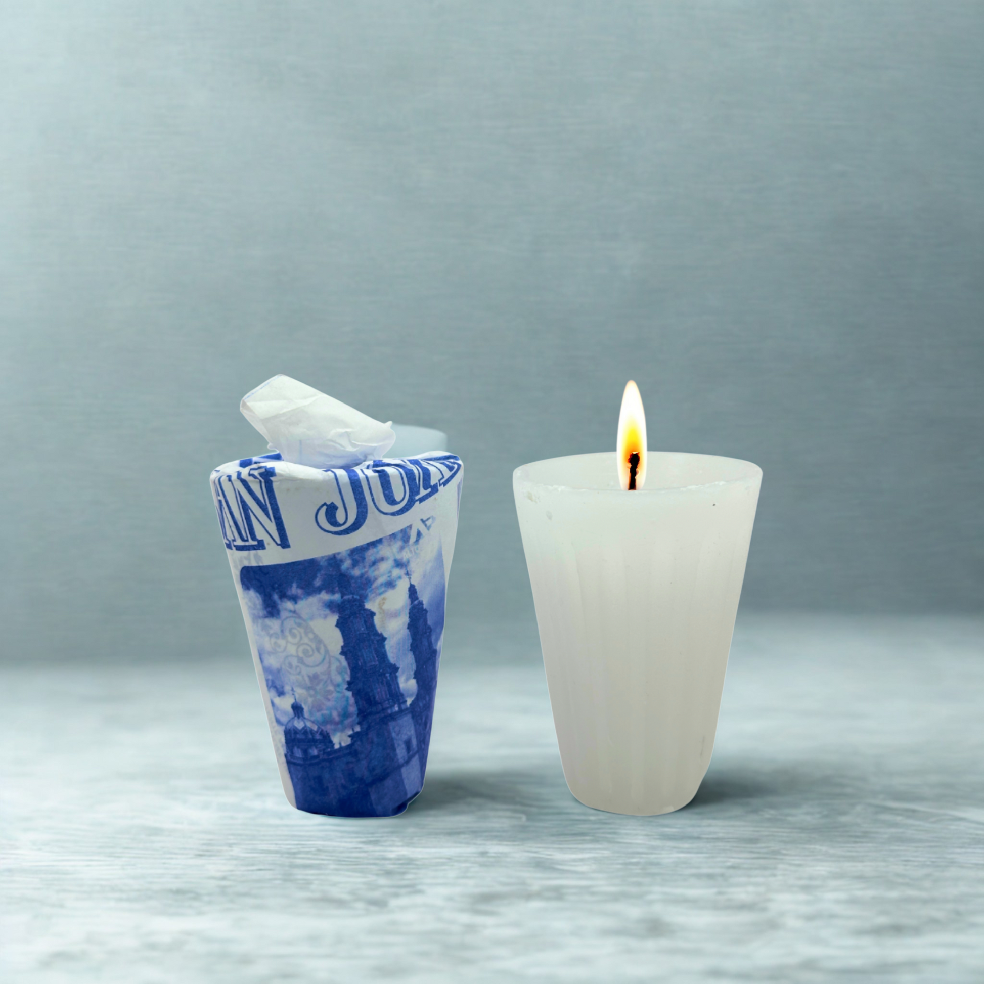 Caja de Veladora San Juan, auténtica obra maestra de iluminación que combina la belleza de una luz suave y difusa con un diseño elegante y versátil. Esta veladora es perfecta para aquellos que buscan una forma única de iluminar su espacio con estilo y sofisticación