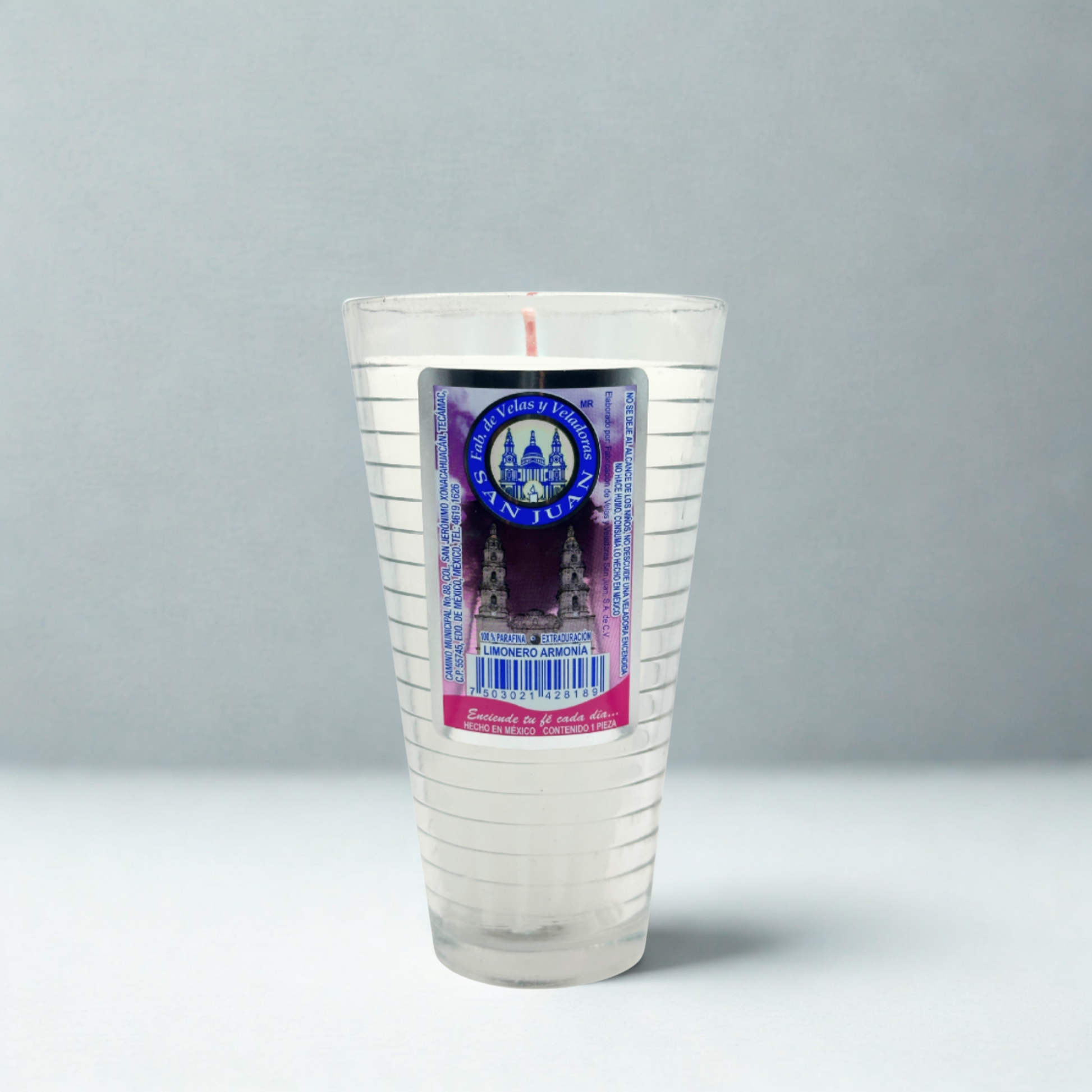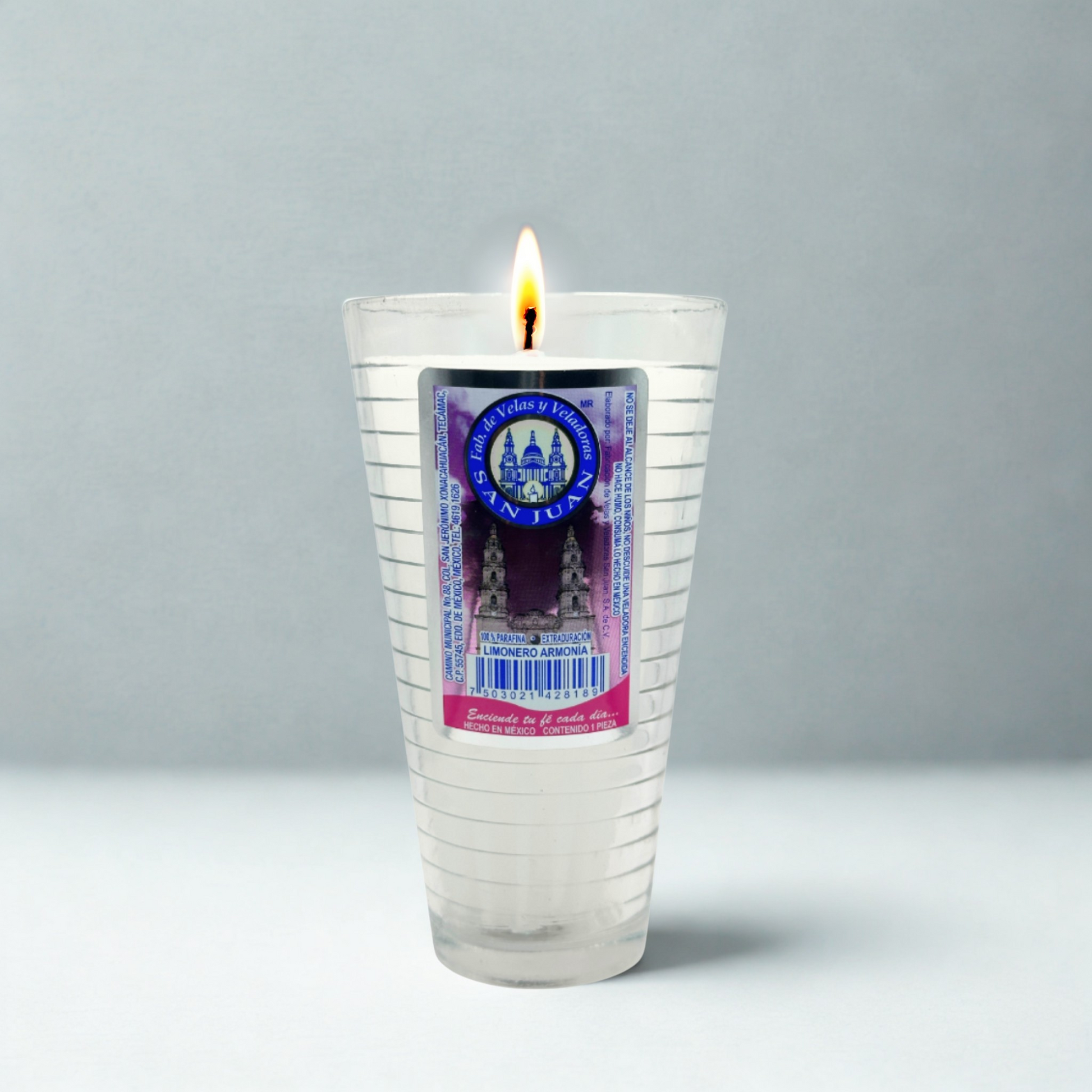 Caja de Veladora San Juan Limonero Armonía, vaso de vidrio, sumérgete en un oasis de frescura y serenidad con nuestra Veladora Limonero Armonía. Esta vela especial combina el cálido resplandor de la luz con el aroma cítrico del limón, creando un ambiente armonioso y revitalizante en tu hogar.