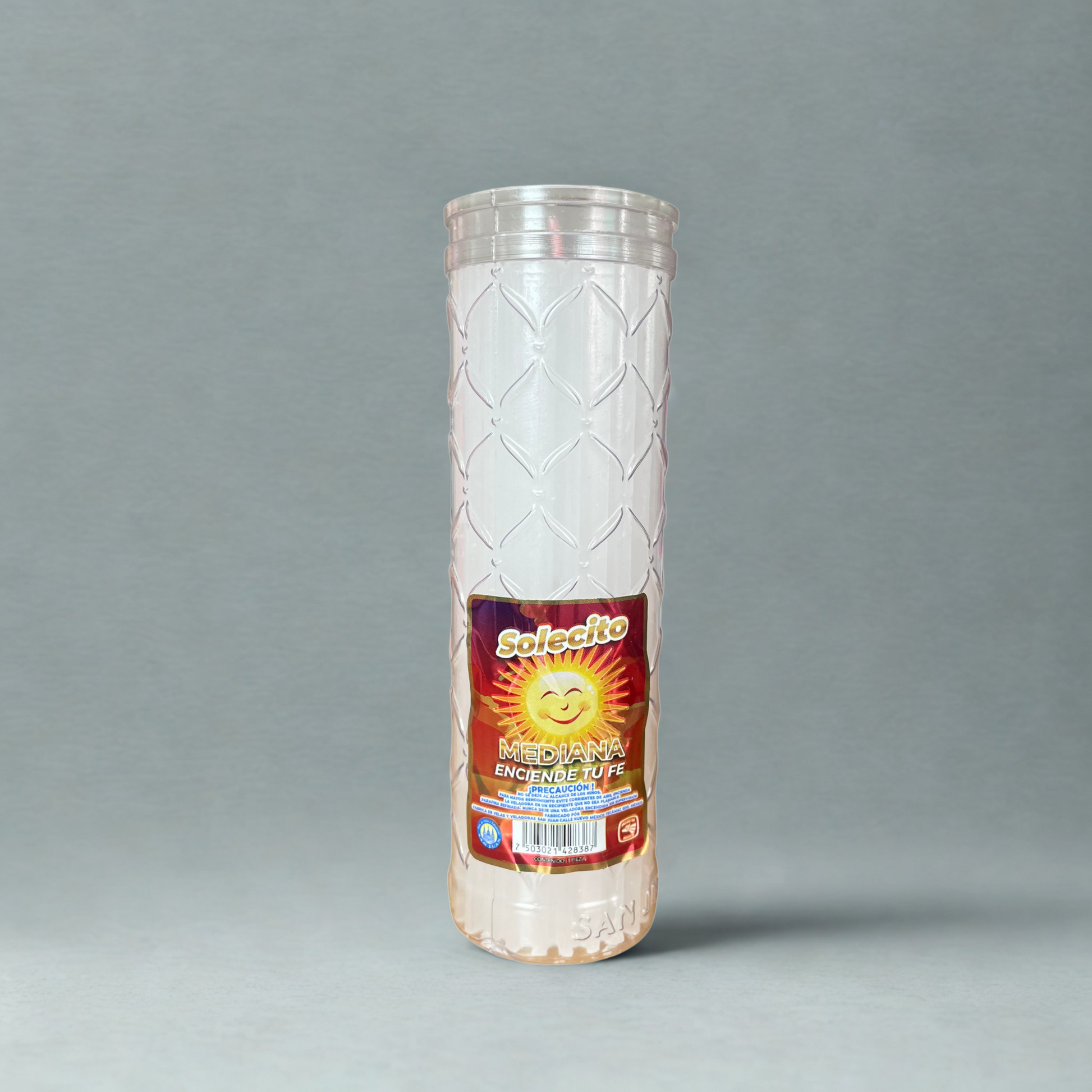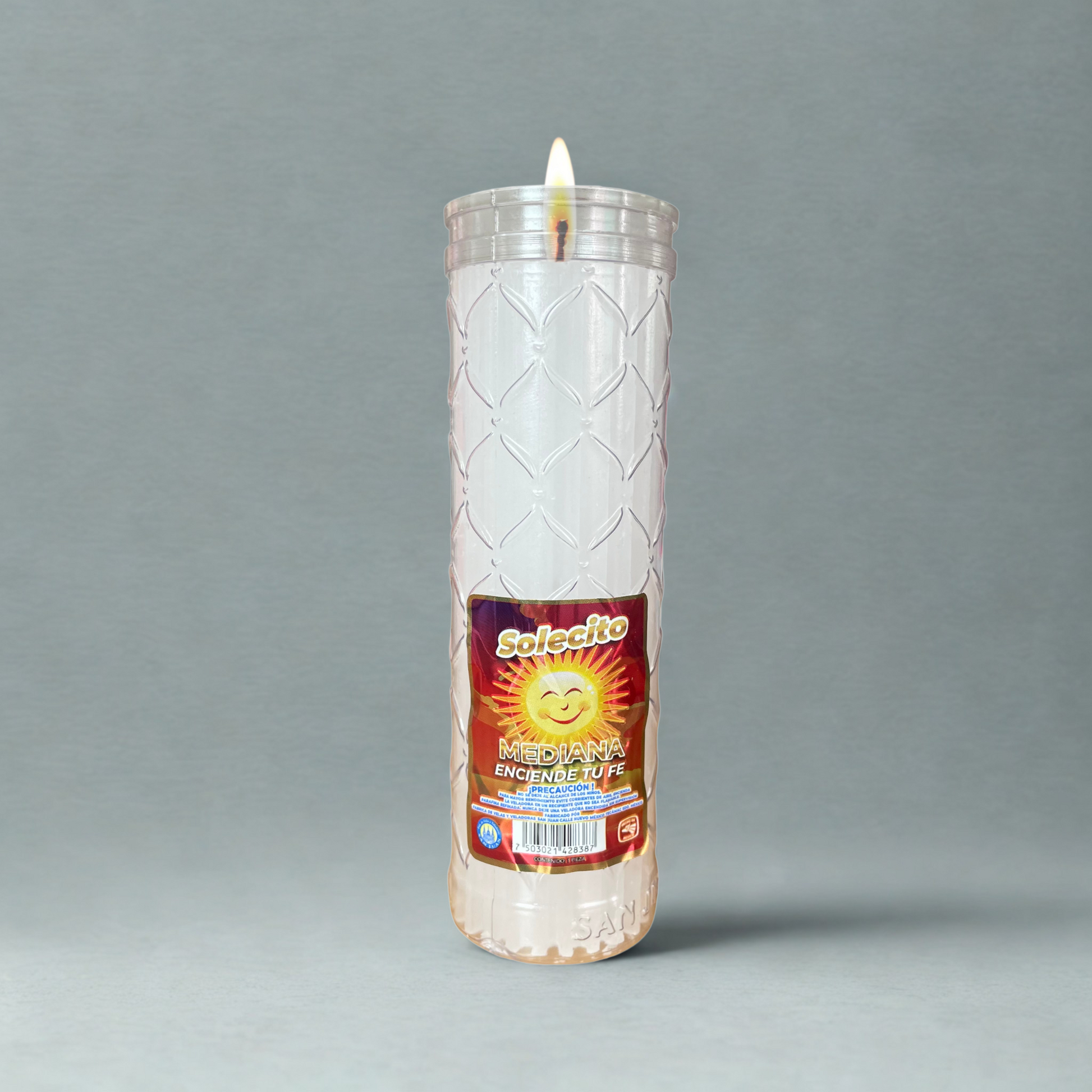 Con duración aproximada de 7 días, esta veladora Solecito es ideal para altares, ofrendas y espacios de oración. Elaborada con parafina rastrada para mantener un precio accesible, y presentada en un vaso ecológico de plástico, reutilizable y resistente.
